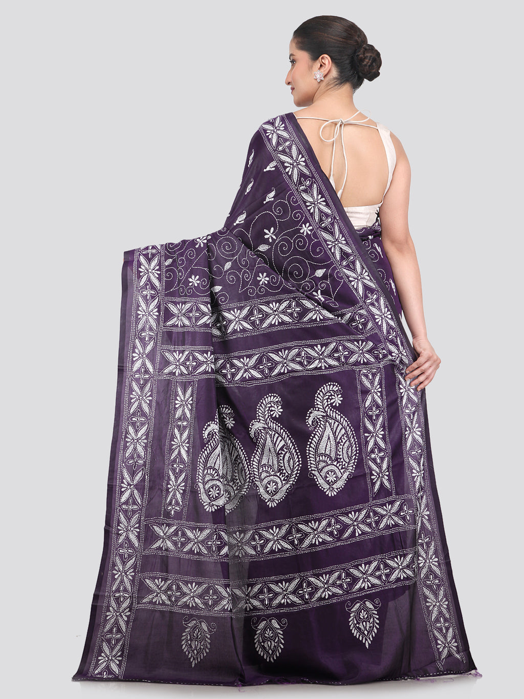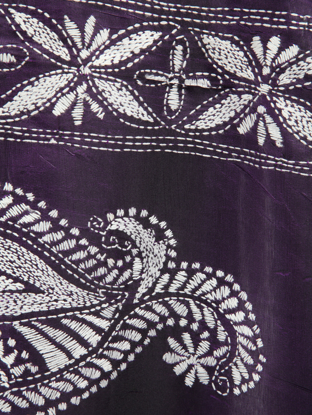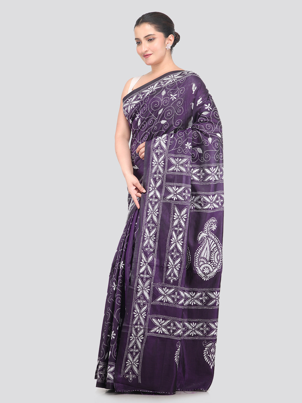 Pinkloom Purple Handloom Silk Embroidered Katha Stitch Work Saree