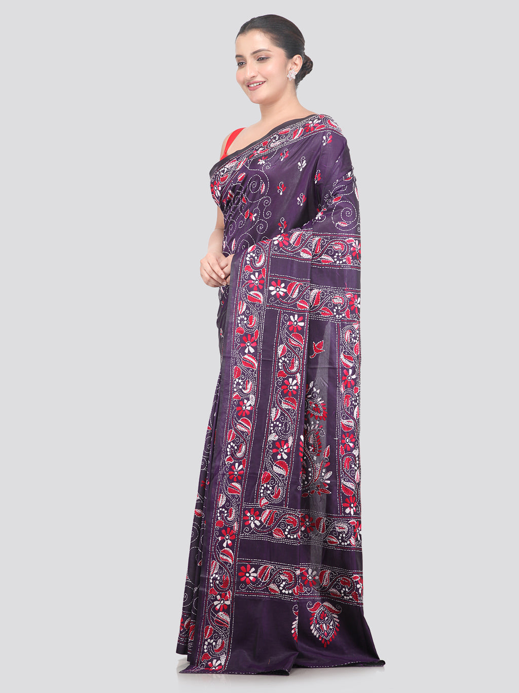 Pinkloom Purple Handloom Silk Embroidered Katha Stitch Work Saree